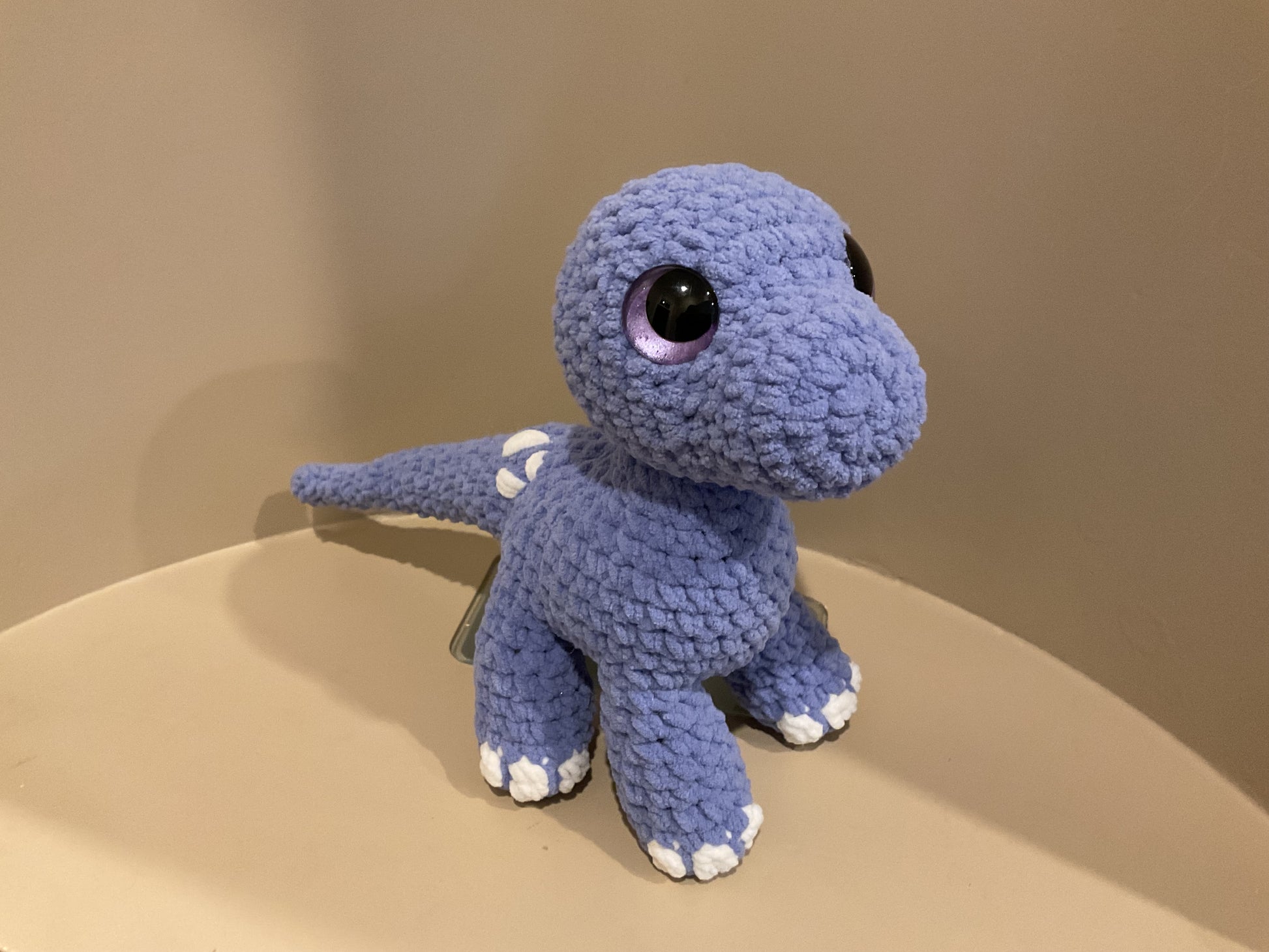 Blueberry is a beautiful baby dino who is made with a soft, chenille yarn. He sits at approximately 10 inches tall and is 12 inches long from snout to tail.